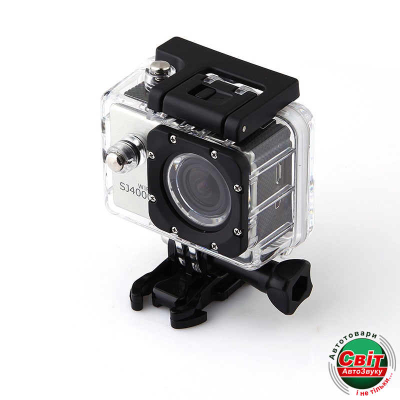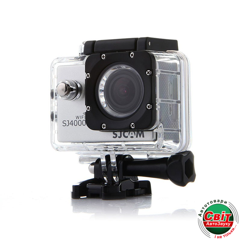 Екшн-камера SJCAM SJ4000 Wi-Fi SilverSJCAM SJ4000 WiFi экшн камера с водонепроницаемым кейсом, снимает FullHD видео 1080р 30к/с. с углом обзора 170 градусов, имеет встроенный дисплей 1,5" для просмотра видео и настройки камеры, съемный аккумулятор, в стандартной комплектации имеет множество креплений