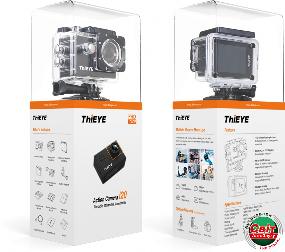 Екшн-камера ThiEYE i20 BlackЕкшн-камера ThiEYE i20 обеспечивает великолепные 1080P 30 кадров в секунду Full HD видео и 12 Mп фотографии, что позволяет снимать высококачественные картинки без ущерба для стильного и компактного стиля i20. Благодаря 170-градусному ультраширокоугольному объективу, 2.0-дюймовому TFT LCD-дисплею, множественным режимам захвата, i20 — идеальная камера, компактная, водонепроницаемая, пригодная для носки и смонтированная.