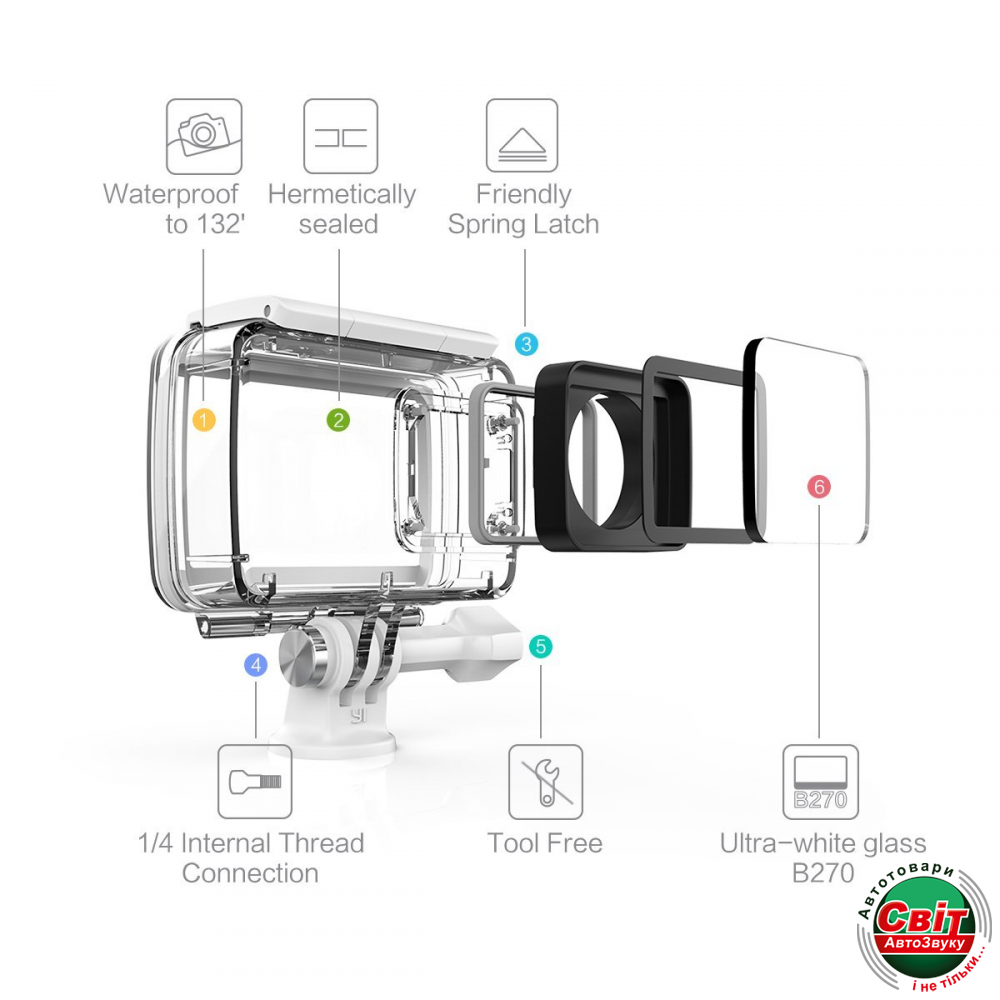 Ультрапрочный, оригинальный водонепроницаемый чехол для экшн-камеры Xiaomi Yi 4K camera имеет класс IP68: осуществляет защиту от пыли и грязи, рассчитан на длительное погружение под воду. Особое ультра-белое стекло B270 обеспечивает высокое качество изображения как под водой, так и на суше. Пропускной коэффициент составляет 98,5%, а значит картинка будет четкой, без дымки и размытий. Конструкция пружины очень простая и удобная, легко открывается, но при этом прочно прилегает, не оставляя зазоров. Классическое крепление с винтом делает чехол совместимым со многими аксессуарами.