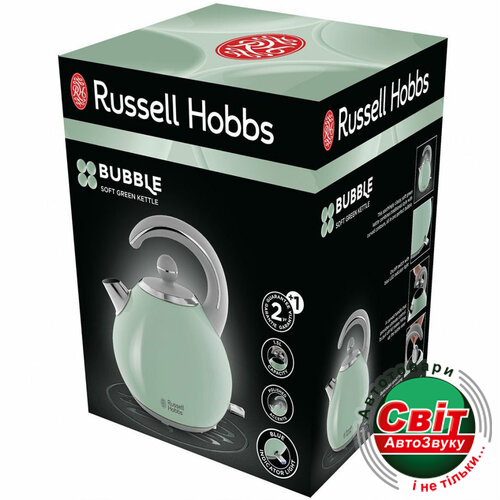 Електрочайник RUSSELL HOBBS 24404-70Встречайте Новинка от легендарного британского бренда с 65-летней историей Russell Hobbs. Чайник из новой линейки приборов для завтрака Bubble в первую очередь выделяется необычным дизайном. Выполнен в нежном оттенка зеленого с милым весенним дизайном и стильными стальными акцентами он безусловно станет не просто кухонным прибором, но и изюминкой интерьера. Такой привлекательный внешний вид повседневной прибора непременно радовать глаз, и задавать вам хорошее настроение на весь день! Мощность чайника наиболее оптимальная - 2300 Вт. А объем 1,5 л, что делает его удобным как для молодой пары, так и семьи с детьми. Прибор также снабжен удобным переключателем с голубой подсветкой. А съемная крышка, внутренний индикатор уровня воды, поворотная на 360 ° база с местом для хранения шнура, съемный фильтр, сделают его использование максимально простым и удобным.