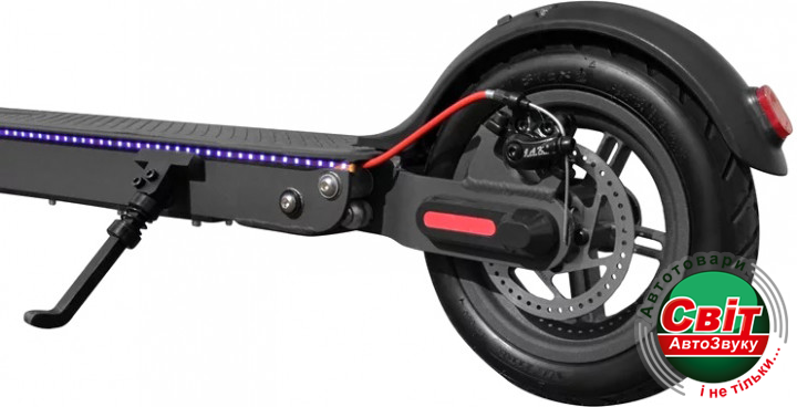 Большие 8 дюймовые колеса и амортизационная подвеска помогают ехать ровно и плавно, компенсируя тряску и вибрации, что особенно заметно на ухабистой и неровной дороге. А задний дисковый тормоз быстро останавливает электросамокат, делая тормозной путь максимально коротким.