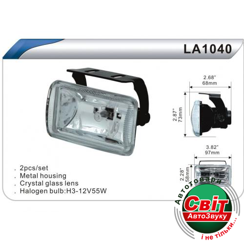 Фара додаткова DLAA 1040 W/H3-12V-55W/97*58mm (компл)Это дополнительная фара от компании DLAA, используется как вспомогательная для главной оптики Вашего автомобиля. Применяется как фара противотуманного света. Они помогают видеть дорогу даже при наиболее неблагоприятных погодных условиях, подсвечивая трассу и обозначают ваш автомобиль. Установка достаточно проста и не прихотливые а работе. Монтажный металлический кронштейн позволяет прикрепить фару как на горизонтальную, так и на вертикальную поверхность.