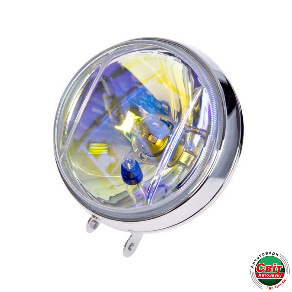 Фара круглой формы, диаметром 143 мм, высота с креплением 166 мм и толщиной 73 мм. Корпус изготовлен из металлического сплава с хромированным покрытием, герметичный, защищен от попадания пыли во внутрь и подходят для работы в разных погодных условиях. Выдерживает эксплуатацию в экстремальных условиях. Стекло фар цвета хамелеон, что дает яркий свет с желтым оттенком. Металлический отражатель значительно усиливает луч и служит для распространение света, с широким углом рассеивания.