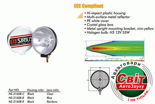 Фара додаткова Sirius NS-2160 B-C H3/12V/55W/D=160mm/кришка (шт.)Противотуманные фары помогают при движении даже в самых плохих погодных условиях: хорошо подсвечивают дорогу и обозначают автомобиль для остальных участников дорожного движения. Плоский и широкий горизонтальный луч, который стелется непосредственно над дорогой, подсвечивает обочину и помогает ориентироваться на любых участках дороги. Выполненные из качественных материалов, они отлично выдерживают эксплуатацию даже в экстремальных условиях.
