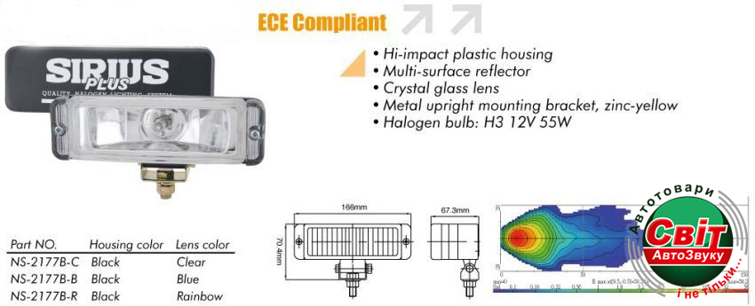- ›Фара додаткова Sirius NS-2177 B-C H3/12V/55W/166*50mm (компл)