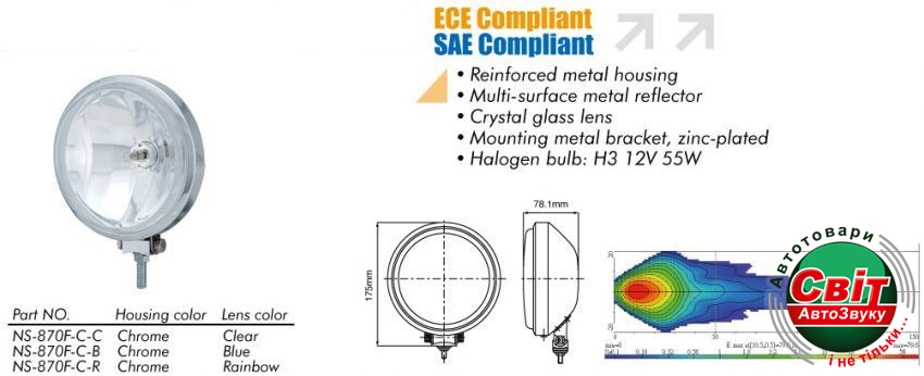 Фара додаткова Sirius NS-870 F-C-C H3/12V/55W/D=160mm(6-1/4") (шт)Особенности: