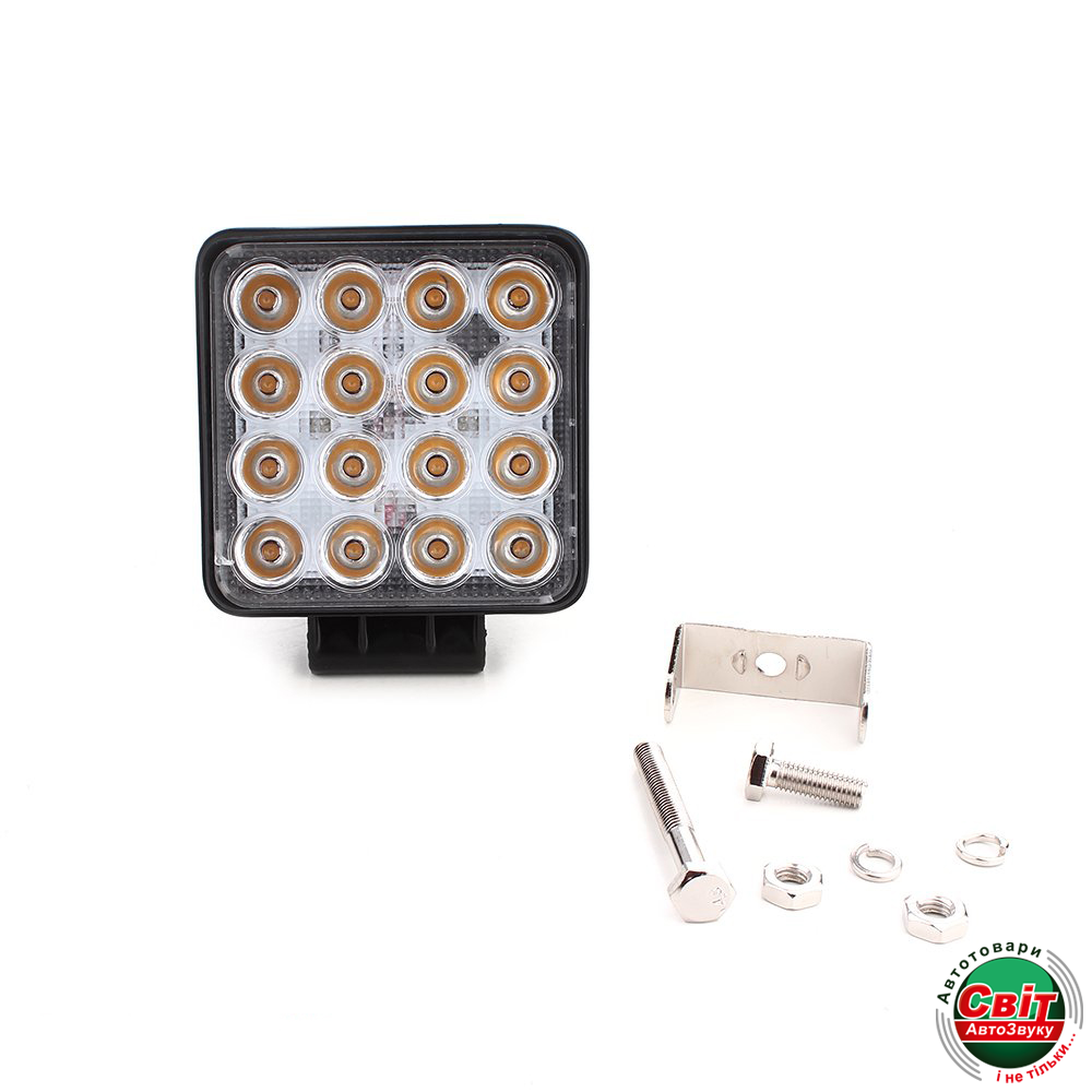 В данной модели 16 диодов, высокой интенсивности. Мощность потребления одного диода 3 Вт, что в сумме дает потребляемую мощность фары в 48 Вт. Свет белый яркий, с цветовой температурой 6000 К, что дает голубой оттенок. Широкий диапазон рабочих напряжений от 9 В до 32 В постоянного тока. Корпус фары квадратной формы, изготовлен из качественного пластика, черного цвета, с прочным стальным монтажным кронштейном, который выдерживает эксплуатацию даже в экстремальных условиях. Линзы, устойчивый к нагреванию и механическим деформациям, формируют достаточно длинный луч с небольшим углом рассеивания. Может полноценно работать при температуре от -40°C до 85°C. Длительный срок службы диодов, более 30000 часов.