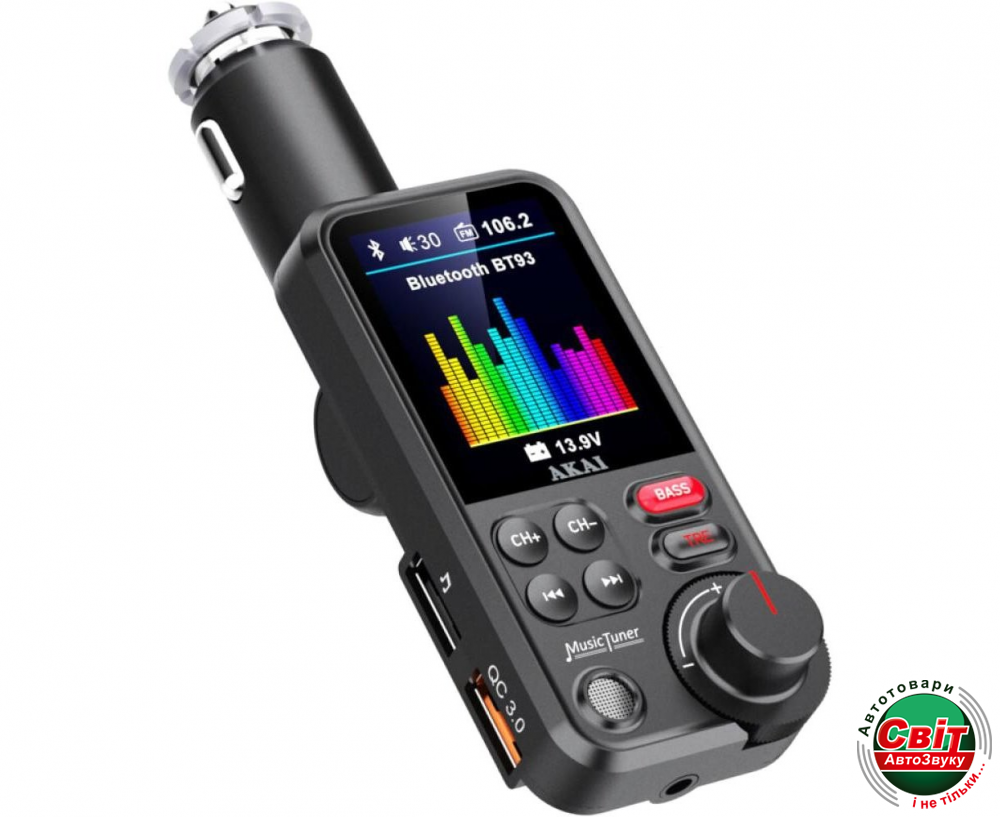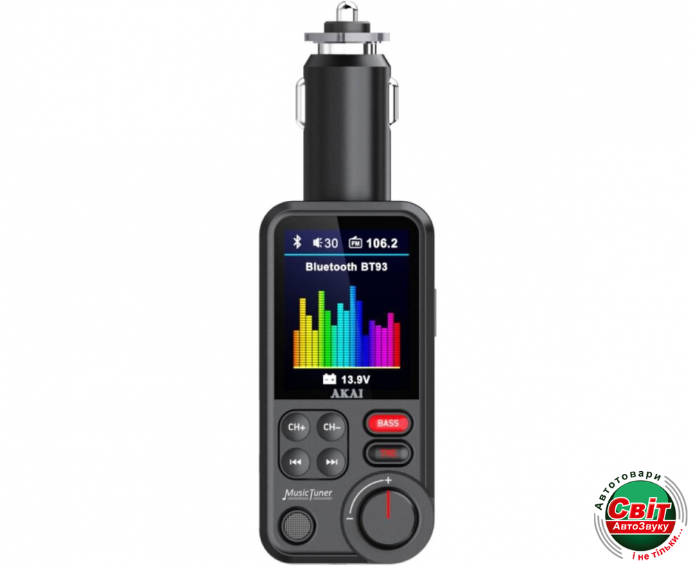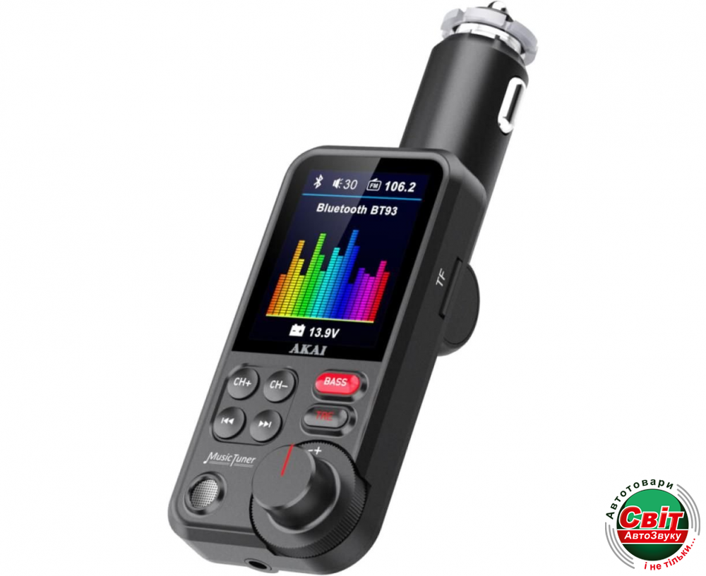 FM-модулятор з блютуз АКАІ FMT-93BT працює за принципом портативної радіостанції, передаючи аудіозаписи зі смартфона або флеш-карти USB/SD карти на радіо-канал вже встановленої в автомобілі магнітоли.