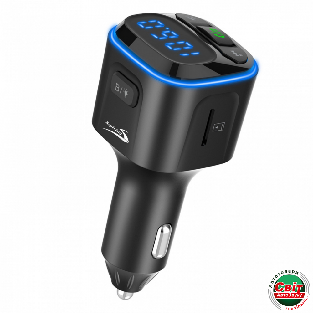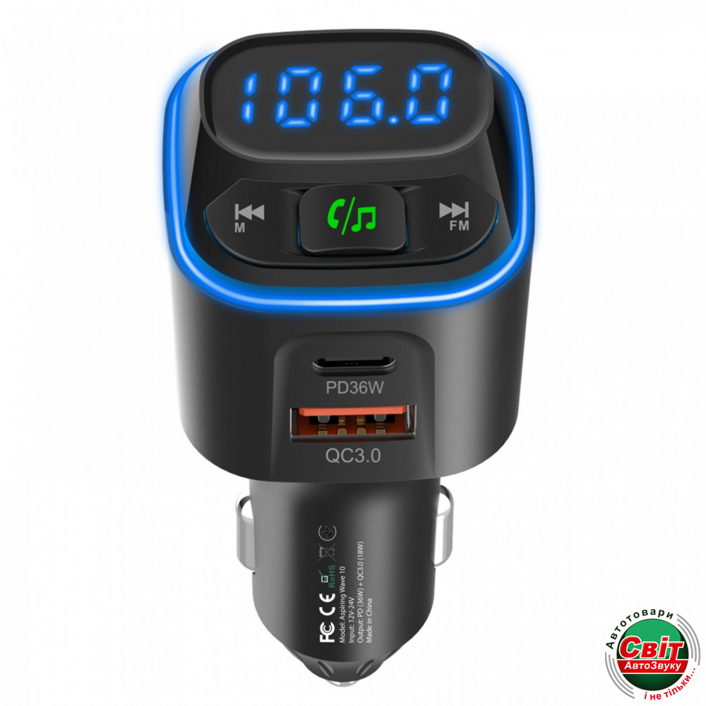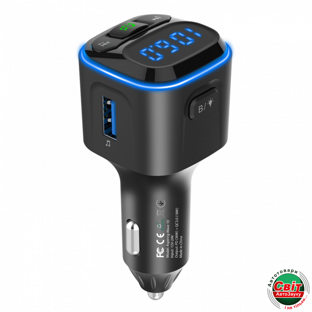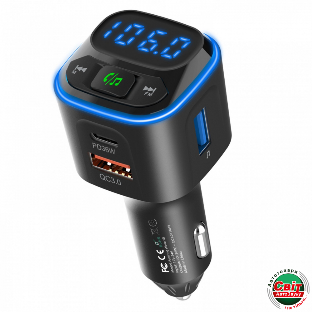 FM-трансмітер Aspiring Wave 10, виконаний у класиці жанру та оснащений портом USB НOST для програвання музики з Флеш карти, QC 3.0 (18W) для швидкої зарядки слот для карти памяті (максимум 64GB) та ще одним зарядним портом Type-C (PD36W) для швидкої зарядки зовнішніх пристроїв.