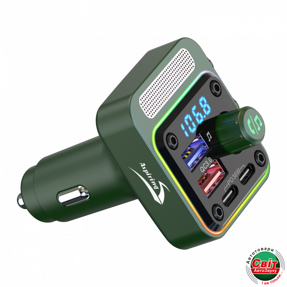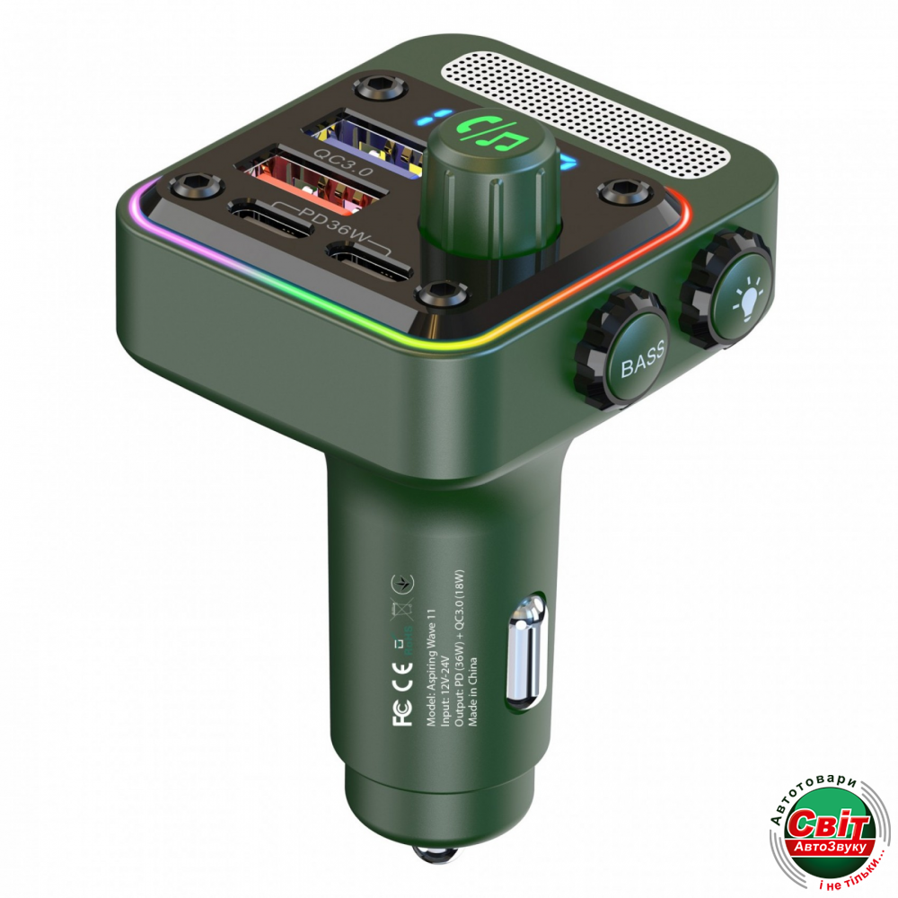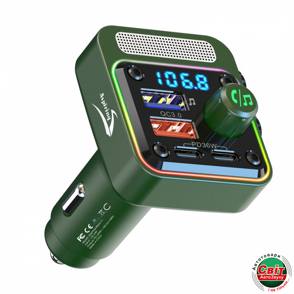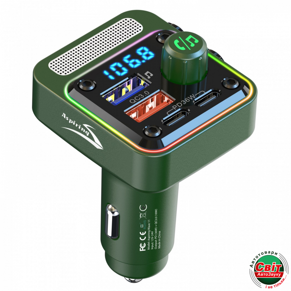 FM-трансмітер Aspiring Wave 11, виконаний у класиці жанру та оснащений портом USB НOST для програвання музики з Флеш карти, QC 3.0 (18W) для швидкої зарядки та ще двома зарядними портами Type-C (PD36W) для швидкої зарядки зовнішніх пристроїв.