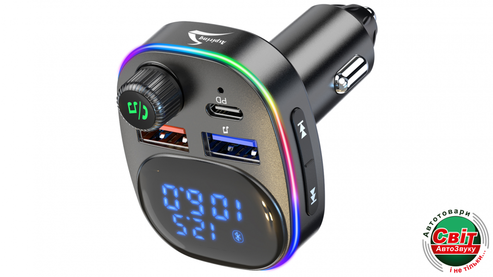 Сучасний FM-трансміттер з RGB підсвіткою, з яким ви можете значно розширити експлуатаційні можливості автомобіля. Він передає аудіофайли на 206 каналах, має діапазон до 5 метрів, сумісний з USB-носіями і оснащений Bluetooth.