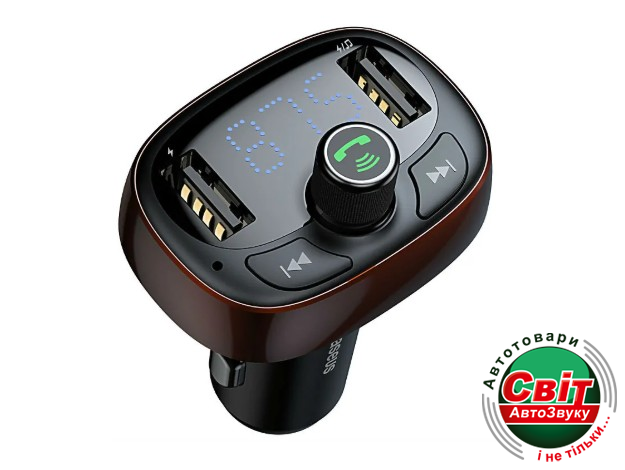 FM-модулятор Baseus T-Typed BT-MP3 2USB Dark CoffeeBaseus T typed Bluetooth MP3 - автомобильное зарядное устройство с функцией трансмиттера, подключаемое к бортовой сети авто через разъем прикуривателя, с двумя портами USB и светодиодным LED дисплеем.