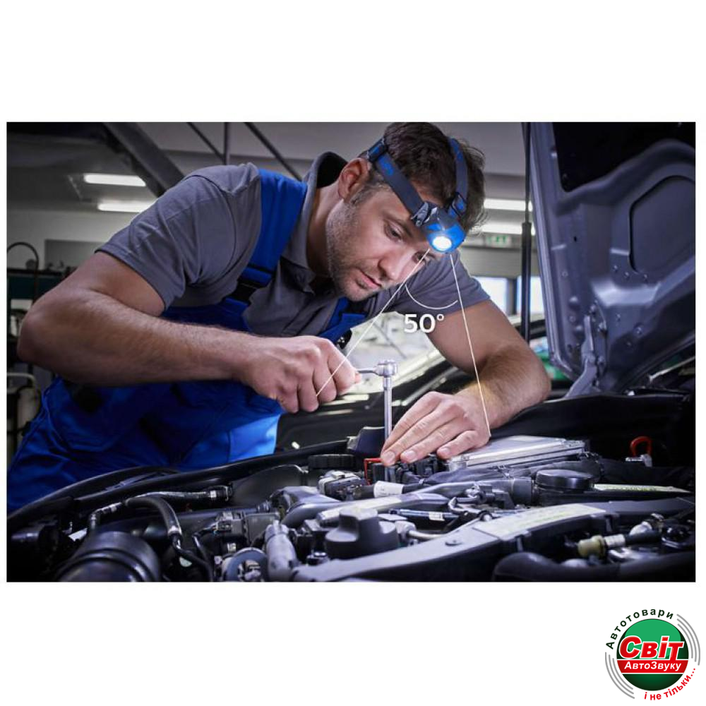 Високопотужний світлодіодний налобний ліхтар Philips - ідеальне рішення для проведення ремонту, якщо вам необхідно, щоб руки були вільні. Промінь світла легко направити завдяки поворотному держателю лампи (90). Форсований режим і режим Eco, а також широкий кут світлового променя для чудового освітлення робочого простору.