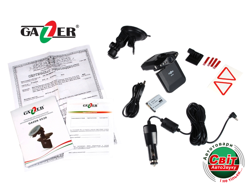 Также в базовый комплект Gazer S520 входит USB-кабель, руководство пользователя, гарантийный талон, копия сертификата УкрСЕПРО и 2 наклейки «Ведётся видеозапись» для соблюдения всех правил законности видеозаписи.
