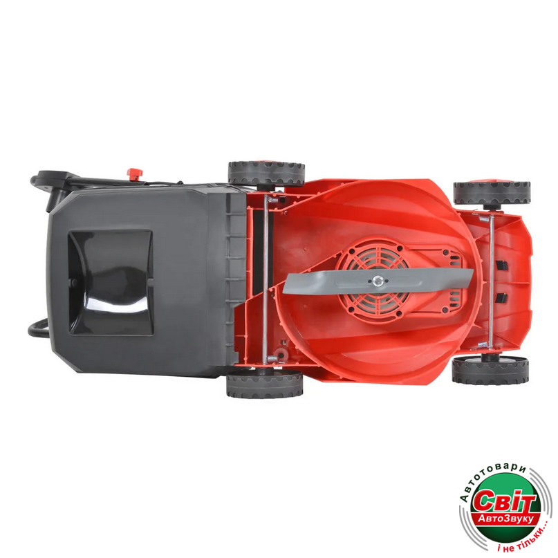 - Об'ємний кошик на 25 літрів збирає скошену траву, не вимагаючи частого опорожнення.