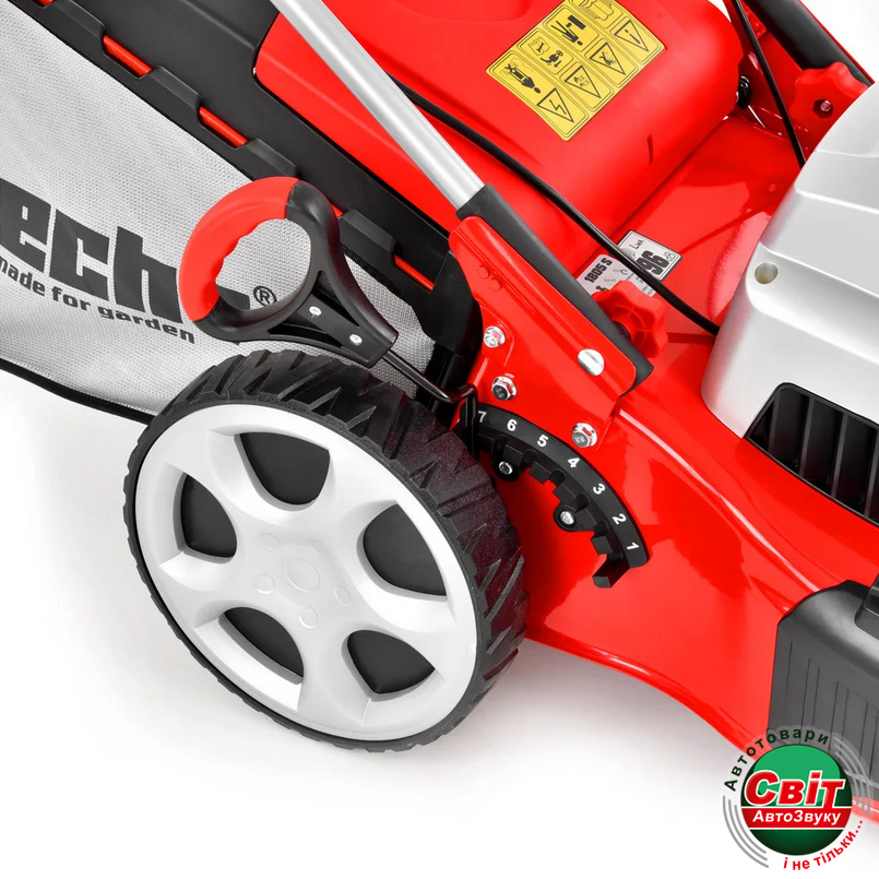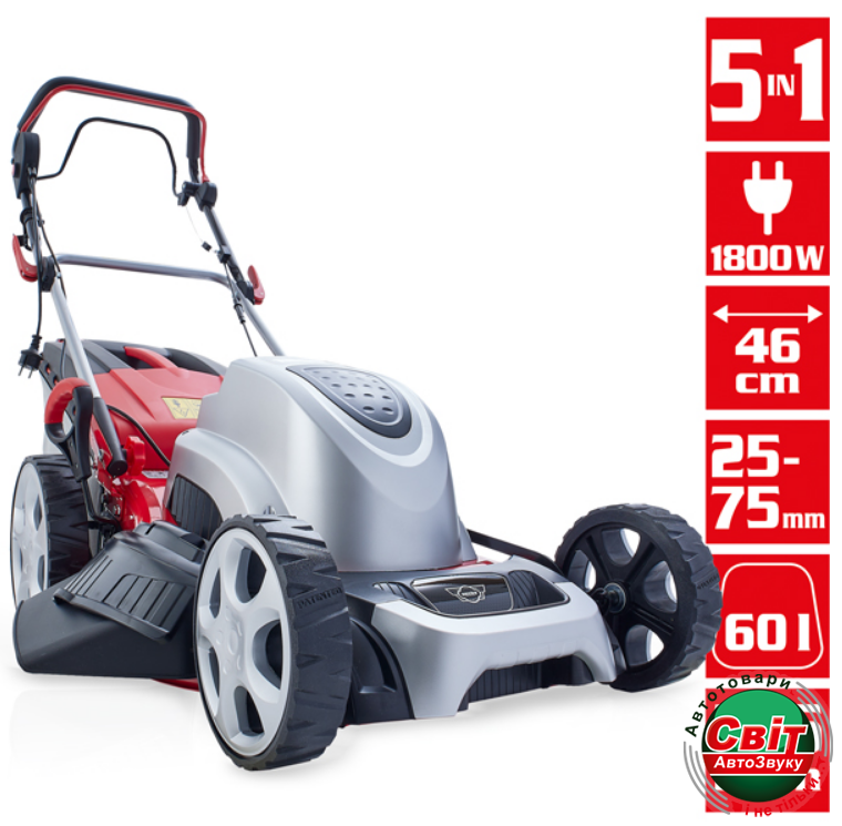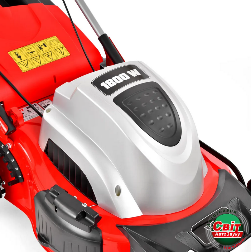 У доповненні з потужним двигуном 1800 Вт дозволяє розвивати швидкість газонокосарки близько 3,6 км / год.