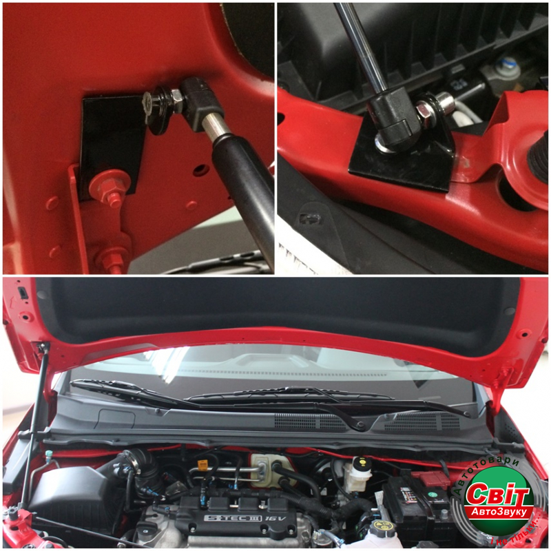Установка проста і не займає багато часу. Зазвичай використовується кріплення, яке вже використовується в авто - кріпиться якась деталь. До цього кріплення ставиться газовий упор, який кріпиться до капота.
