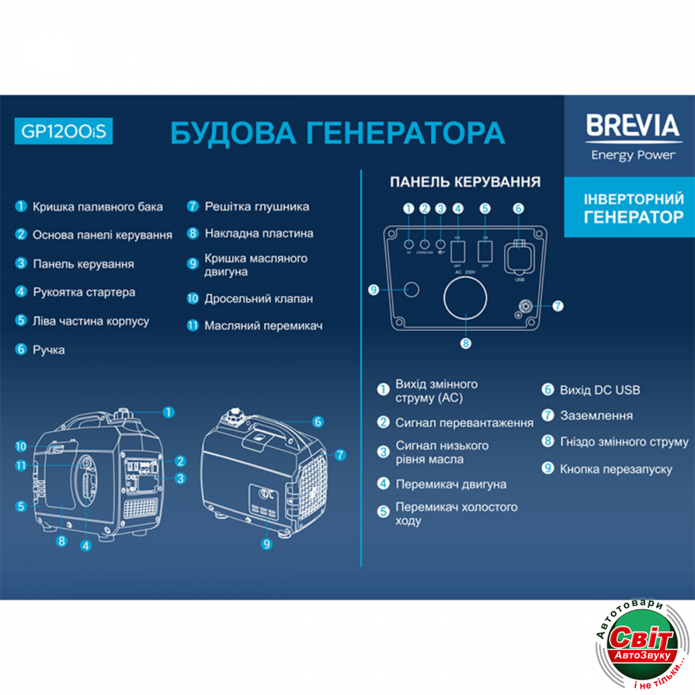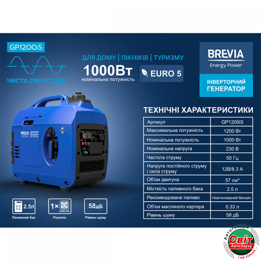 - ›Генератор Brevia GP1200iS інверторний бензиновий 1,2кВт (ном 1,0кВт)
