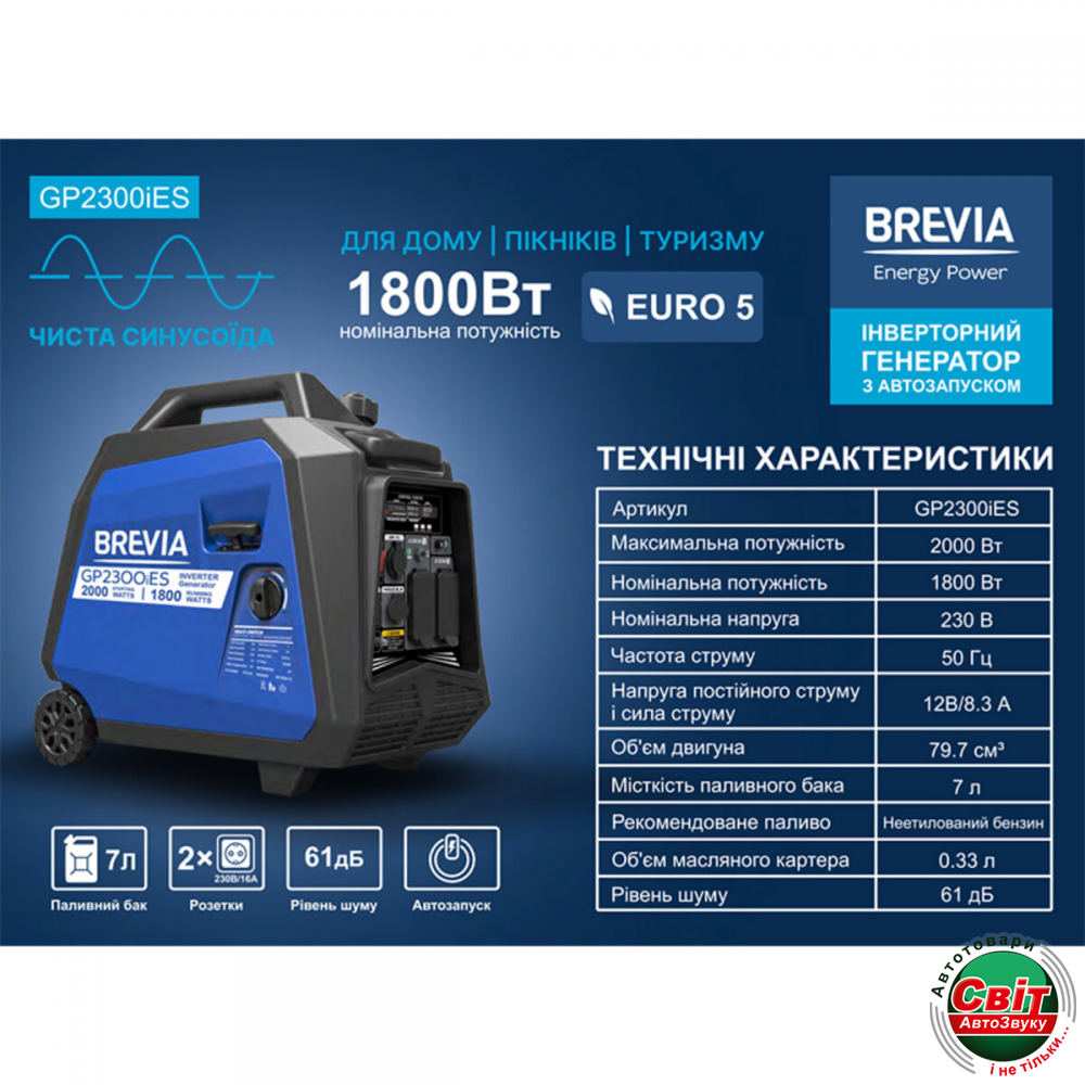 - ›Генератор Brevia GP2300iES інверторний бензиновий 2,0кВт (ном 1,8кВт) з електростартером