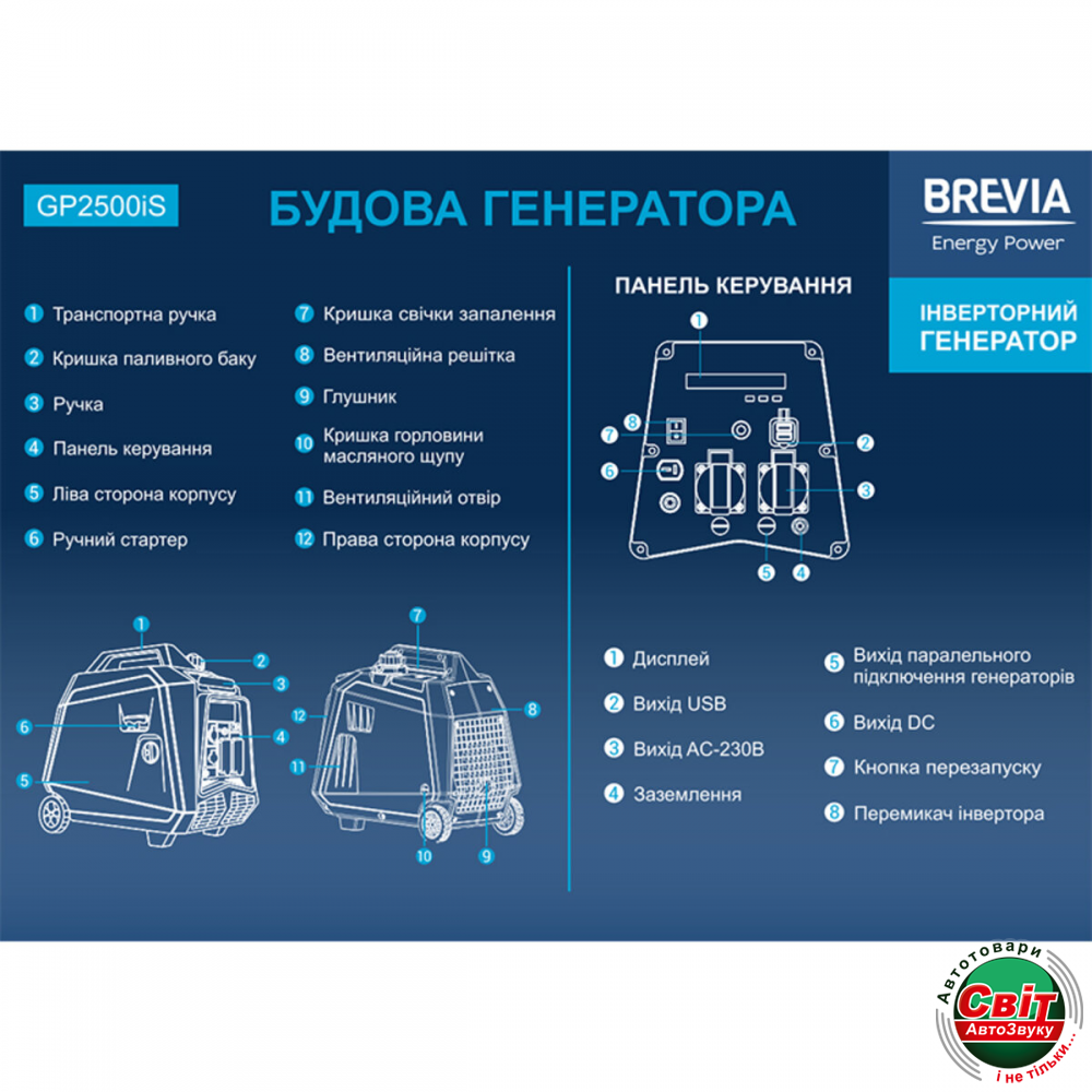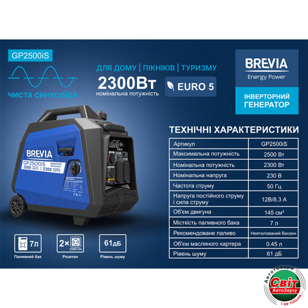 Генератор Brevia GP2500iS інверторний бензиновий 2,3кВт (ном 2,5кВт)