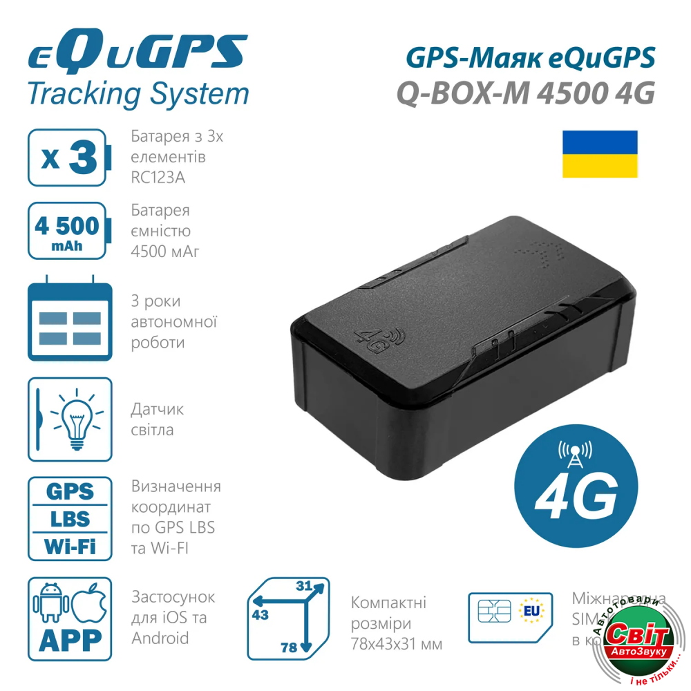 GPS трекер eQuGPS Q-Box-M 4500-4G (TravelSim)GPS-Маяк (Пошуковий маяк) – це компактний електронний пристрій з автономним живленням, який ховається в автомобілі чи іншому рухомому об’єкті і за заданим інтервалом вмикається та передає своє місцезнаходження. Він не під’єднуються до бортової мережі автомобіля і тому його дуже легко сховати в авто та дуже важко виявити при візуальному пошуку. Основне завдання GPS-Маяка – у випадку виникнення екстреної ситуації (Викрадення автомобіля чи іншого рухомого об’єкту) увімкнутися та передати його місцезнаходження.