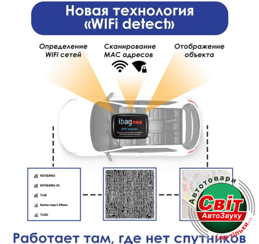 а) Сучасна система позиціонування WIFI Detect. Визначення розташування об’ єкта за WIFI мережами. Таким чином, координатор "Ibag" працює там, де більшість GPS координаторів не здатні працювати. Звичайні маяки не можуть визначати розташування об’єкта в гаражі, підземному паркунгу, будівлі. Вони визначають локацію за базовими станціями, де погрішність може перевищувати 1000 метрів. Трекери "Ibag" можуть визначити позиціонування з точністю 1-50 метрів при виявленні всього 3 стаціонарних WiFi точок так само, трекер здатний з точністю від 50 до 250 метрів визначити своє розташування, якщо поруч є хоча б одна стаціонарна WiFi мережу.