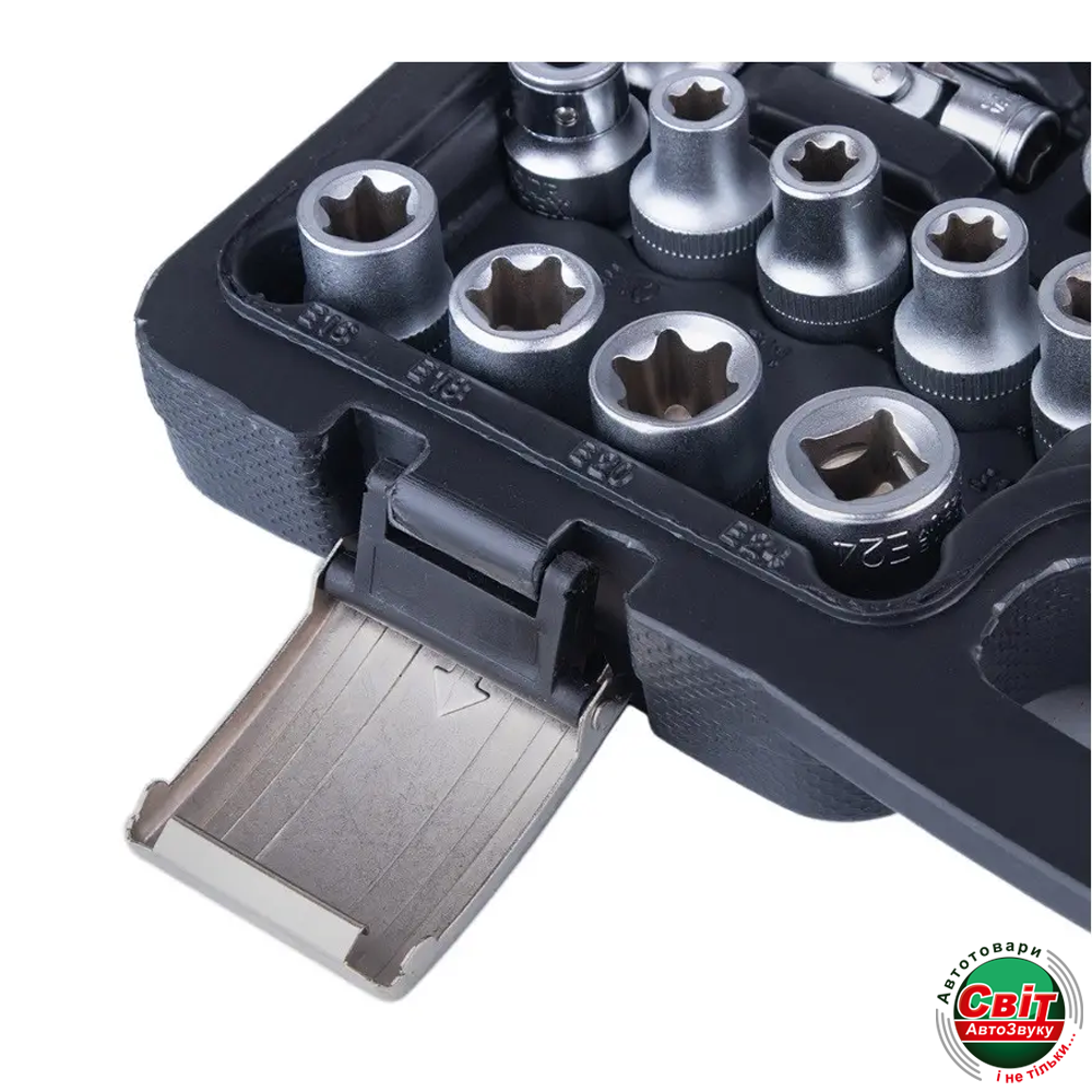 Крім торцевих головок у комплекті також є зручні тріскачки, карданчик і подовжувачі.