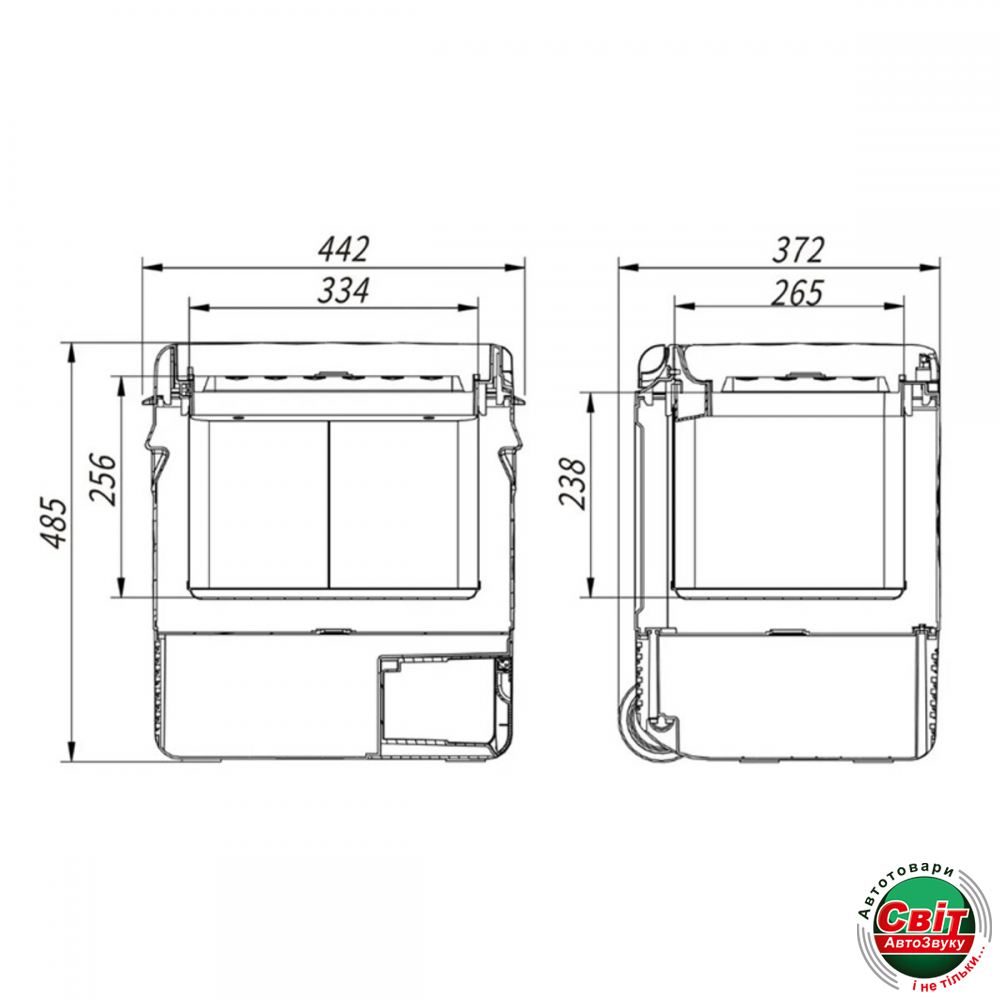 - Розміри: Зовнішній: 334x238x265 мм; Внутрішній: 442x485x372 мм