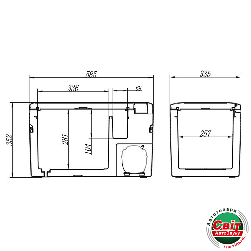 З вагою 10,9 кг та компактними розмірами 585x335x350 мм (зовнішні) та 333x260x280 мм (велике відділення), автомобільний холодильник можна легко розмістити в машині або в інших місцях.