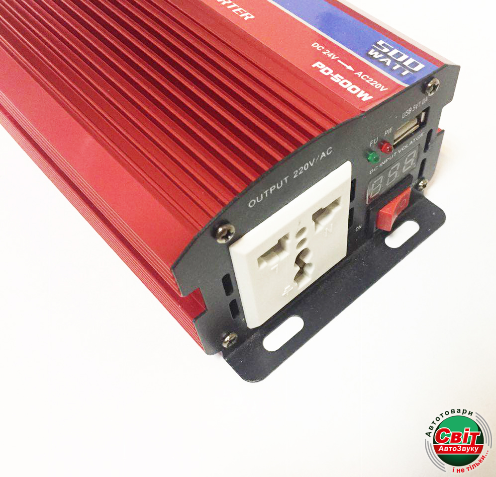 Інвертор PowerOne Plus 12V-220V 500W + USB/LED (PD-500W)Призначений для перетворення постійного струму 12 В у змінний струм 220В / 50Гц. Використовується для зарядки і роботи: ноутбуків, відеокамер, телефонів, всілякої аудіо - і відеотехніки та інших електроприладів. Для зручного користування є 2 роз'єми для підключення ЗУ: стандартна розетка і роз'єм USB. Інвертор можливо підключити як в прикурювач, так і безпосередньо до акумулятора. Дроти для підключення йдуть в комплекті.