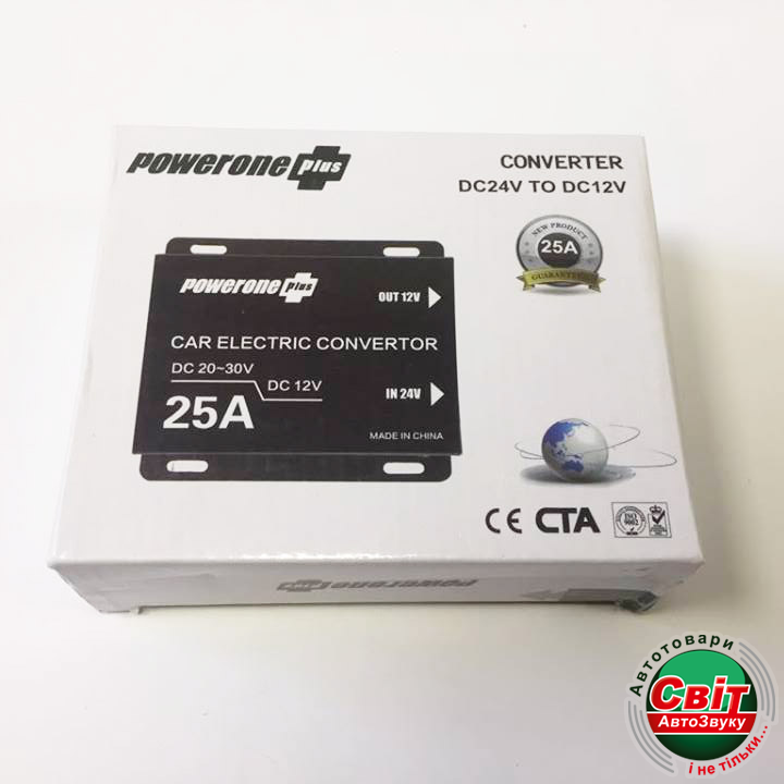 Інвертор PowerOne Plus (24V-12V) 25AІнвертор 24-12V 25А. Служить для перетворення постійної напруги 24V в 12V. Область застосування: вантажні автомобілі, автобуси та інші транспортні засоби з бортовим напругою мережі 24V. Має запобіжник на керуючому кабелі АСС.
