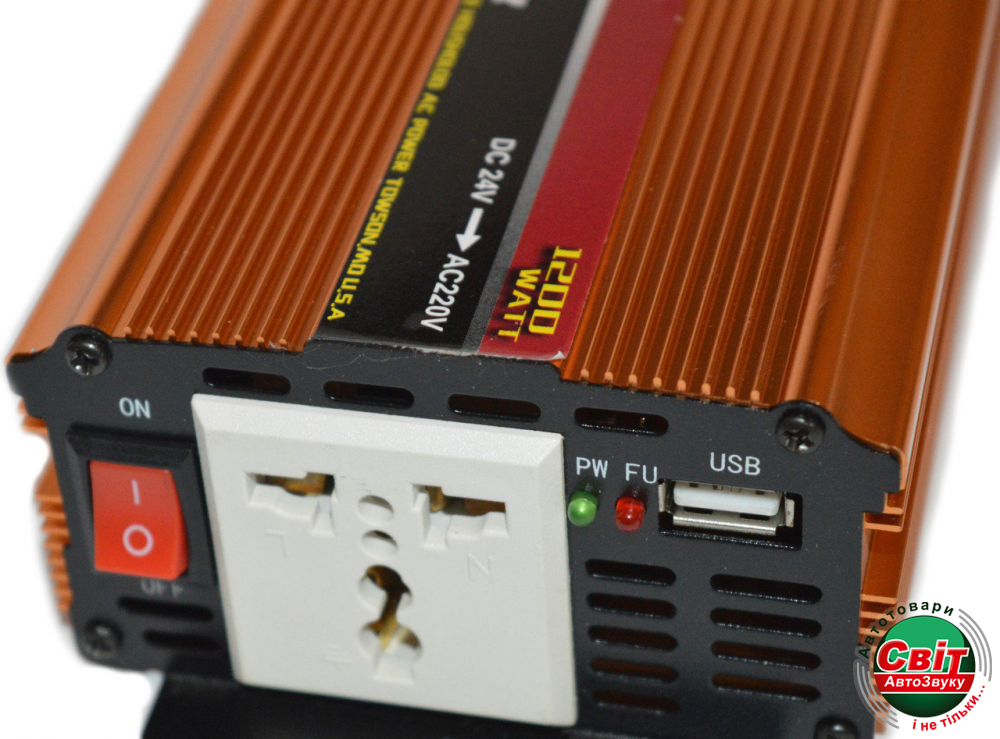 Інвертор PowerOne Plus 24V-220V 1200W + USB (SST-1200A)Предназначен для преобразования постоянного тока 24 В в переменный ток 220В / 50Гц. Используется для зарядки и работы: ноутбуков, видеокамер, телефонов, всевозможной аудио- и видеотехники и прочих электроприборов. Для удобного пользования есть 2 разъёма для подключения ЗУ: стандартная розетка и разъём USB. Инвертор возможно подключить как в прикуриватель, так и напрямую к аккумулятору. Провода для подключения идут в комплекте.