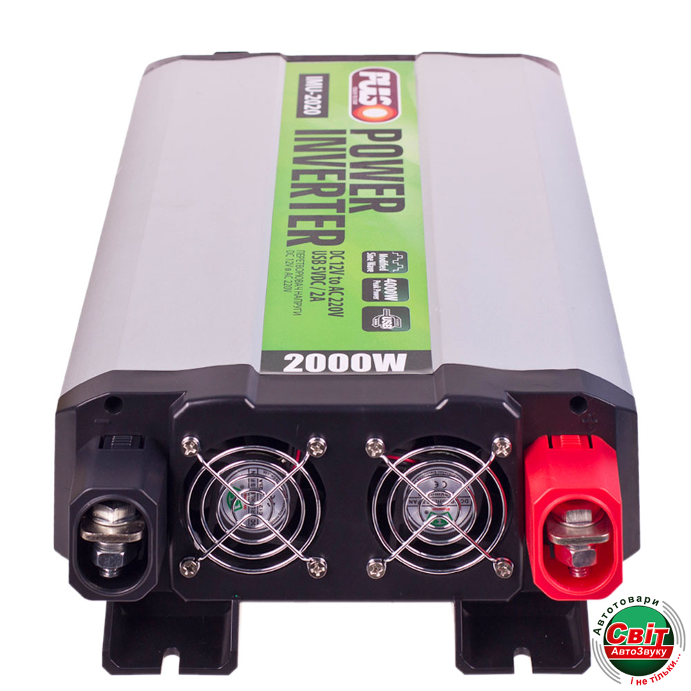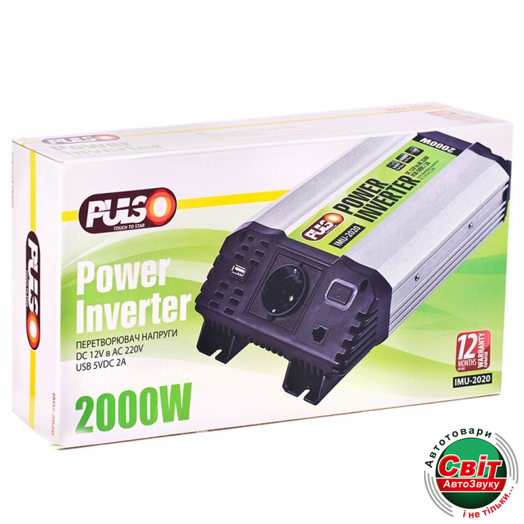 Інвертор PULSO IMU-2020 (12/220V/2000W/USB-5VDC2.0A)Інвертор перетворює 12 В бортового напруги автомобіля в 220 В змінного з частотою 50Hz на виході. Авто інвертор дозволяє використовувати в вашому автомобілі звичайні побутові прилади, які ви зазвичай використовуєте вдома і на роботі.