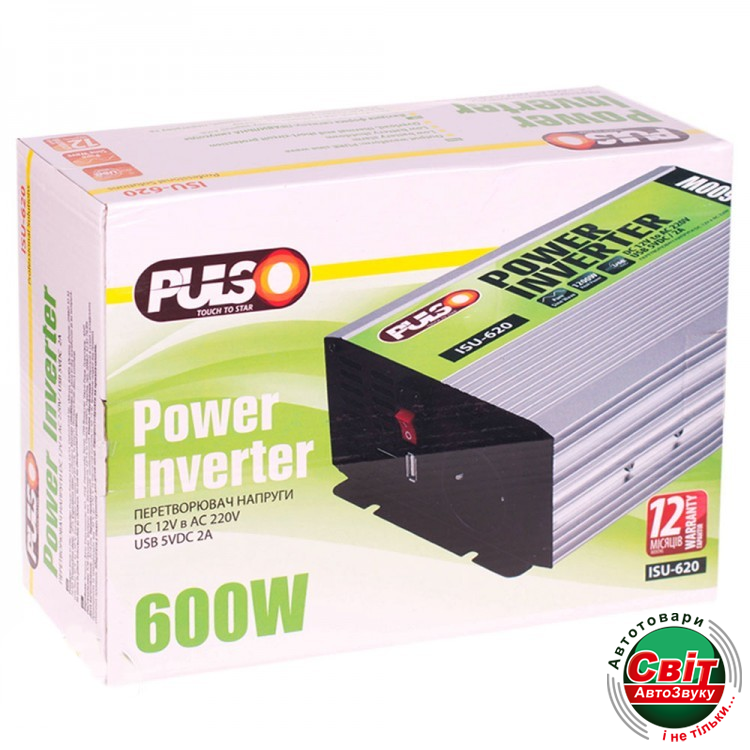 Інвертор PULSO ISU-620 (12/220V/600W/USB-5VDC2.0A)Інвертор перетворює 12 В бортового напруги автомобіля в 220 В змінного з частотою 50Hz на виході. Авто інвертор дозволяє використовувати в вашому автомобілі звичайні побутові прилади, які ви зазвичай використовуєте вдома і на роботі.
