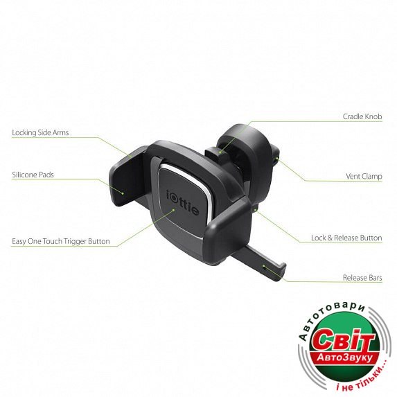 Тримач iOttie Easy One Touch 4 Air Vent Mount (HLCRIO126)IOTTIE Easy One Touch 4 Air Vent Mount - это компактное и простое решение для удерживания смартфона в машине. Тримач можно легко закрепить в вентиляционное отверстие. Запатентованная в США технология позволяет легко монтировать и снимать смартфон одной рукой, одним касанием и за считанные секунды. Боковые крепления закрываются автоматически, надежно удерживая смартфоны, у которых ширина 2.3" - 3.50" (8 - 8.89 см).