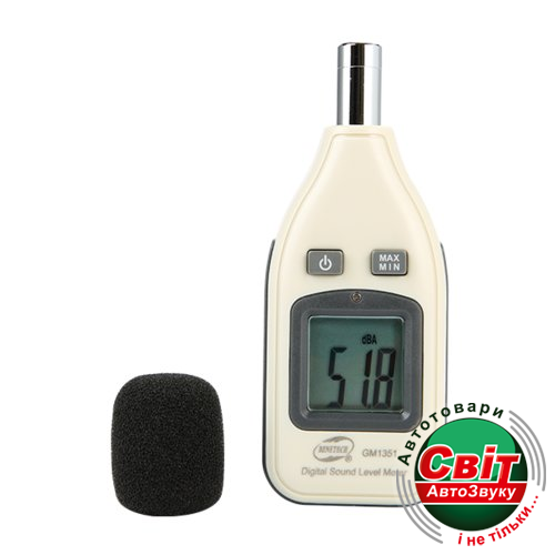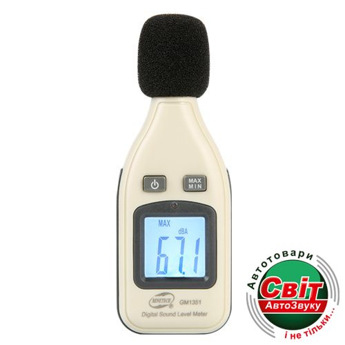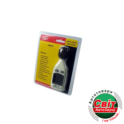 Вимірювач рівня шуму (шумомір) Benetech GM1351Шумомір GM1351 відрізняється широким діапазоном від 30 до 130 дБ і точністю 0,1 дБ. Завдяки частоті вимірювання 2 рази в секунду і можливості фіксації максимального свідчення ви зможете проводити виміри газодинамічних шумів. Модель GM1351 оснащена датчиком світла для автоматичного включення підсвічування дисплея в умовах недостатньої освітленості і функцією авто-відключення.