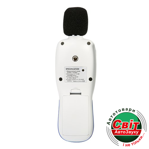 Вимірювач рівня шуму (шумомір) Wintact WT85BОсновным предназначением данной модели является измерение уровня шума в диапазоне от 30 до 130 дБ. Шумомер WT85B оснащён высокочувствительным микрофоном, ёмкостного типа, способным регистрировать звуковые колебания а широком диапазоне частот (от 31,5 Гц до 8 кГц). Отличительной чертой шумоміра WT85B является наличие Bluetooth интерфейса, с помощью которого можно связаться с приложением мобильного телефона и обработать результаты измерений. Данный шумомір способен не только отображать текущие значения измерений, но и удерживать на дисплее минимальные и максимальные результаты измерений. Большой ЖКИ дисплей данной модели шумоміра, оснащён яркой подсветкой, для работы в условиях слабого освещения. Индикация низкого заряда батарей позволит вовремя заменить элементы питания прибора. Питание данного шумоміра реализовано 3-мя батарейками 1,5 В., распространённого типоразмера "ААА",а длительный срок службы батарей обеспечивает функция автоматического отключения питания прибора.