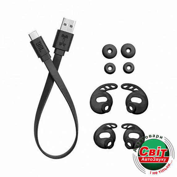 - Комплектація: Навушники, 3X насадки для вух, Вушні ласти 3X Sport Flex Fit, Чехол для зарядки, USB-кабель типу C, 12-місячне преміум-член UA MAPMYRUN, 1 QSG, Гарантійний талон