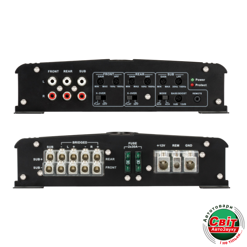 90 Вт х 2 (Мост, 4Ом) + 340 Вт х 1 (2Ом)