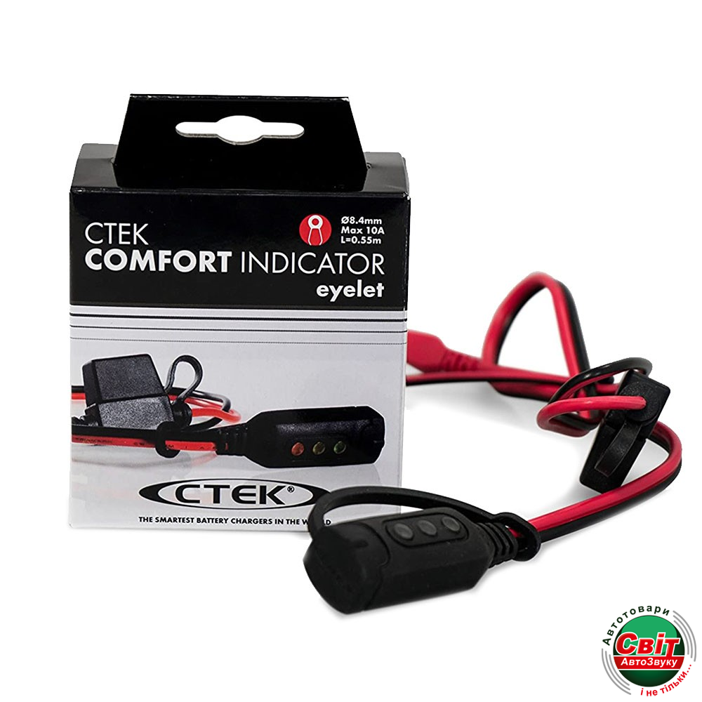 INDICATOR Eyelet - індикатор з роз'ємом, ідеально підходить для заряджання та перевірки батарей, які встановлені у важкодоступних місцях. Система світлофор просто і чітко показує стан заряду батареї. Підключіть виводи (вушники) до батареї, перевірте стан, потім підключіть роз'єм до зарядного пристрою CTEK, якщо батарея потребує заряджання.