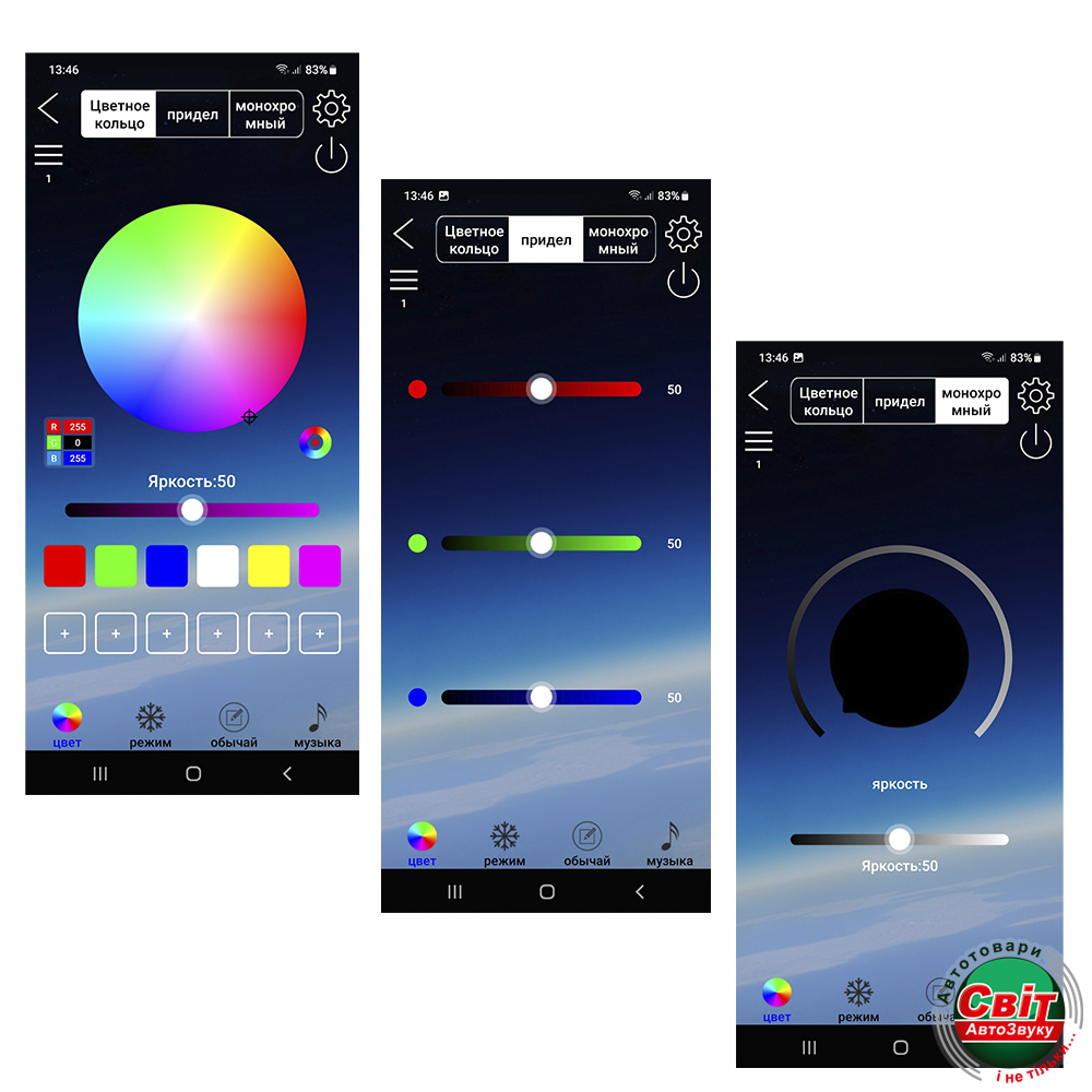 - Можливості застосунку: вибір кольору, яскравості та режиму світіння