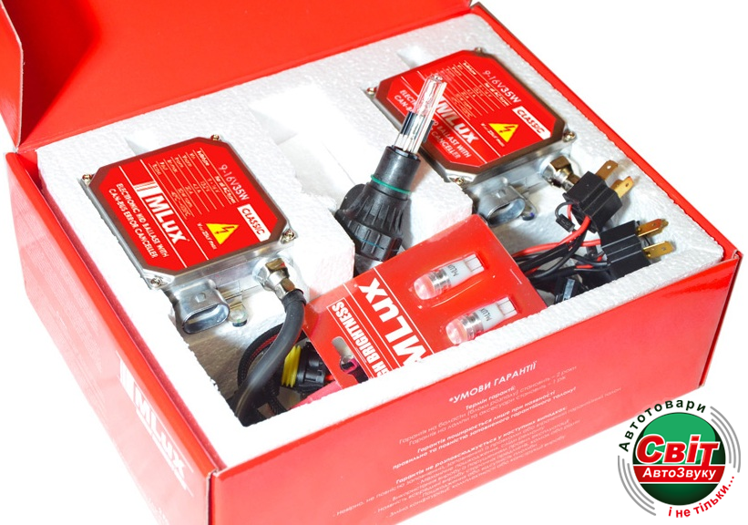 В комплект поставки входит: би-ксеноновая лампа MLux 35 Вт (2 шт.), электронный балласт (блок розжига) MLux CLASSIC 9-16 В 35 Вт с системой имитации присутствия лампы (2 шт.), коммутация, аксессуары для установки и монтажа, гарантийный талон.
