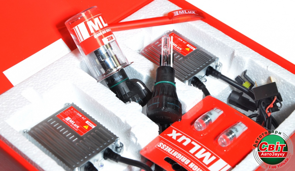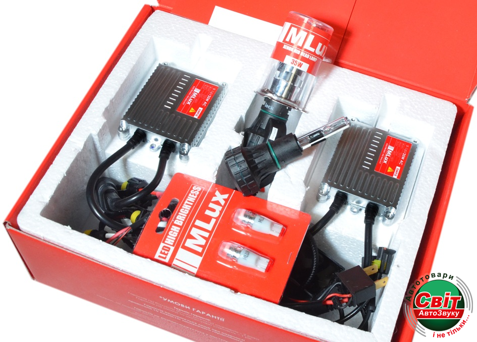 В комплект поставки входит: би-ксеноновая лампа MLux 35 Вт (2 шт.), электронный балласт (блок розжига) MLux SIMPLE 9-16 В 35 Вт (2 шт.), коммутация, аксессуары для установки и монтажа, гарантийный талон.