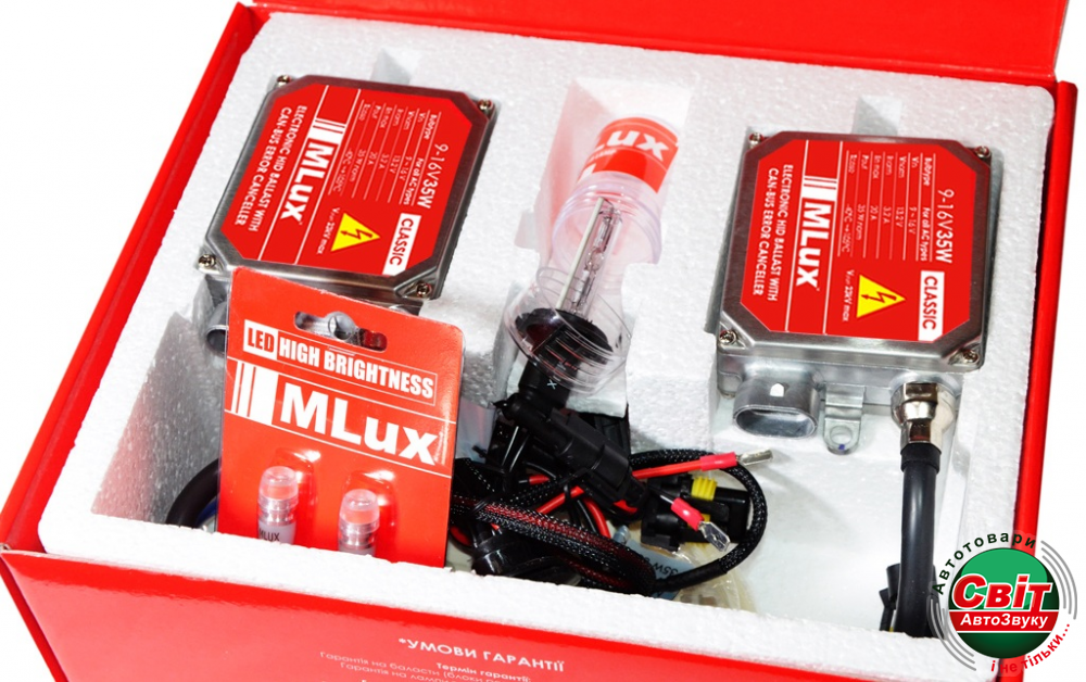 В комплект поставки входит: ксеноновая лампа MLux 35 Вт (2 шт.), электронный балласт (блок розжига) MLux CLASSIC 9-16 В 35 Вт с системой имитации присутствия лампы (2 шт.), аксессуары для установки и монтажа, гарантийный талон.