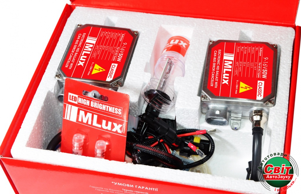 В комплект поставки входит: ксеноновая лампа MLux 50 Вт (2 шт.), электронный балласт (блок розжига) MLux CLASSIC 9-16 В 50 Вт с системой имитации присутствия лампы (2 шт.), аксессуары для установки и монтажа, гарантийный талон.