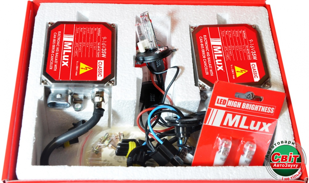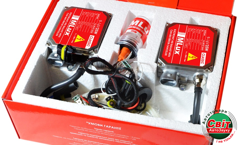 В комплект поставки входит: лампа ксенон+галоген MLux 35 Вт (2 шт.), электронный балласт (блок розжига) MLux CLASSIC 9-16 В 35 Вт с системой имитации присутствия лампы (2 шт.), аксессуары для установки и монтажа, гарантийный талон.
