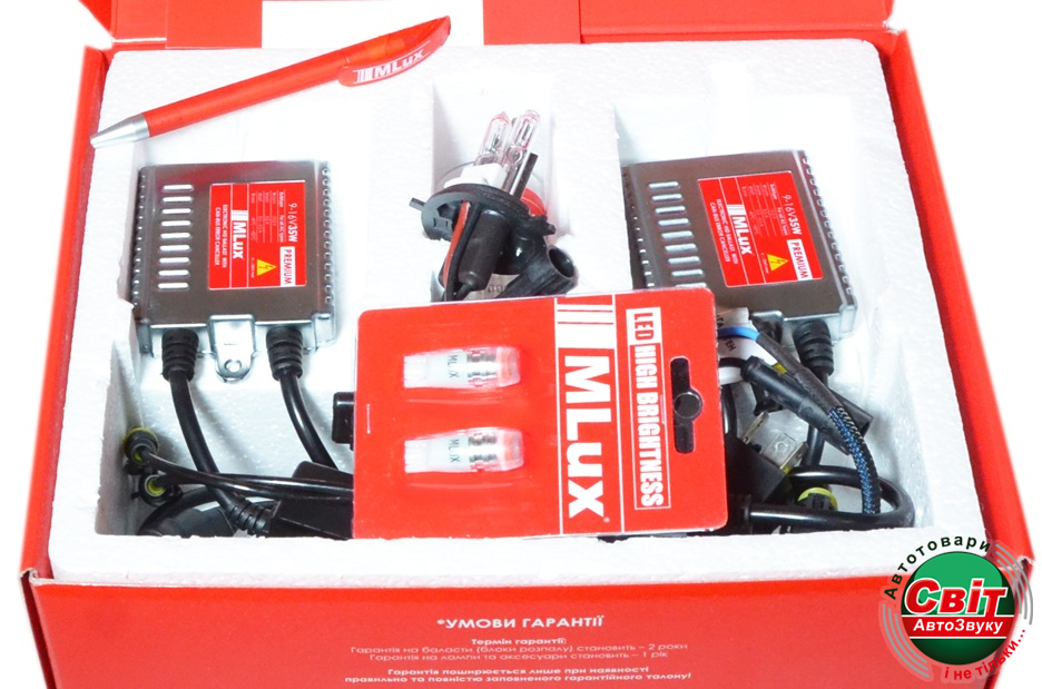 В комплект поставки входит: лампа ксенон+галоген MLux 35 Вт (2 шт.), электронный балласт (блок розжига) MLux PREMIUM 9-16 В 35 Вт с системой имитации присутствия лампы (2 шт.), аксессуары для установки и монтажа, гарантийный талон.