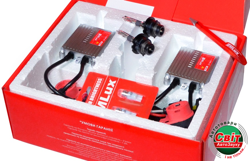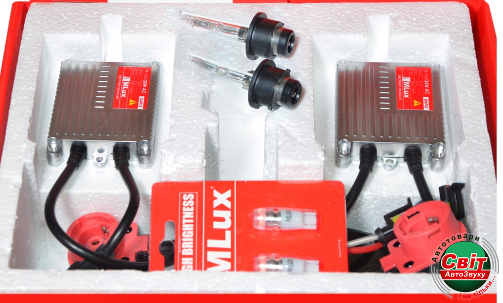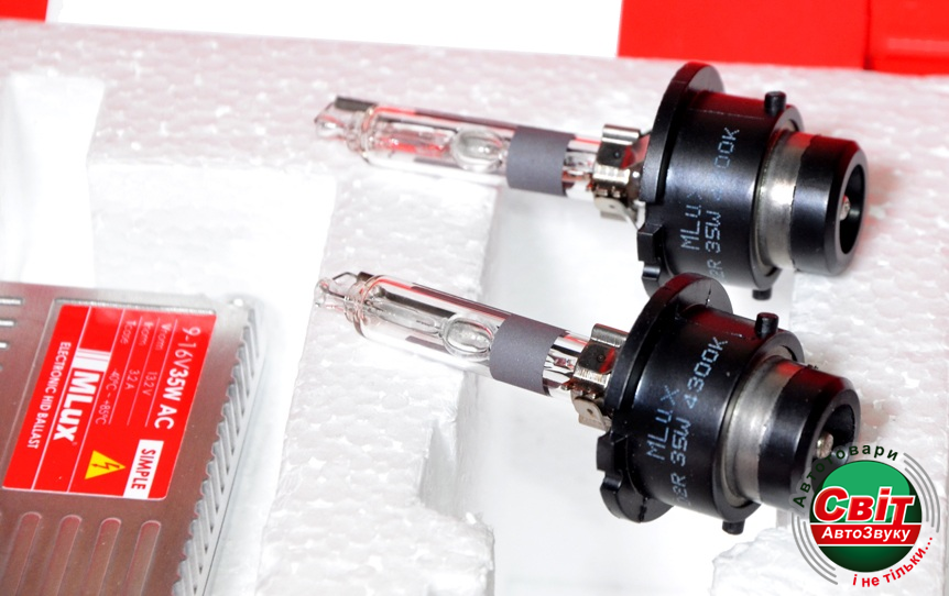 В комплект поставки входит: ксеноновая лампа MLux 35 Вт (2 шт.), электронный балласт (блок розжига) MLux SIMPLE 9-16 В 35 Вт (2 шт.), переходник с разъемов AMP на D2 (2 шт.), аксессуары для установки и монтажа, гарантийный талон.