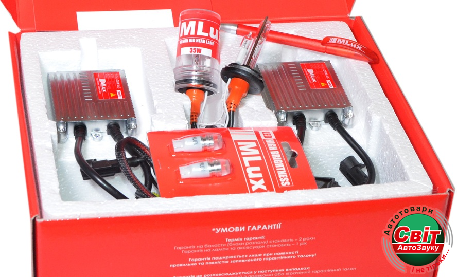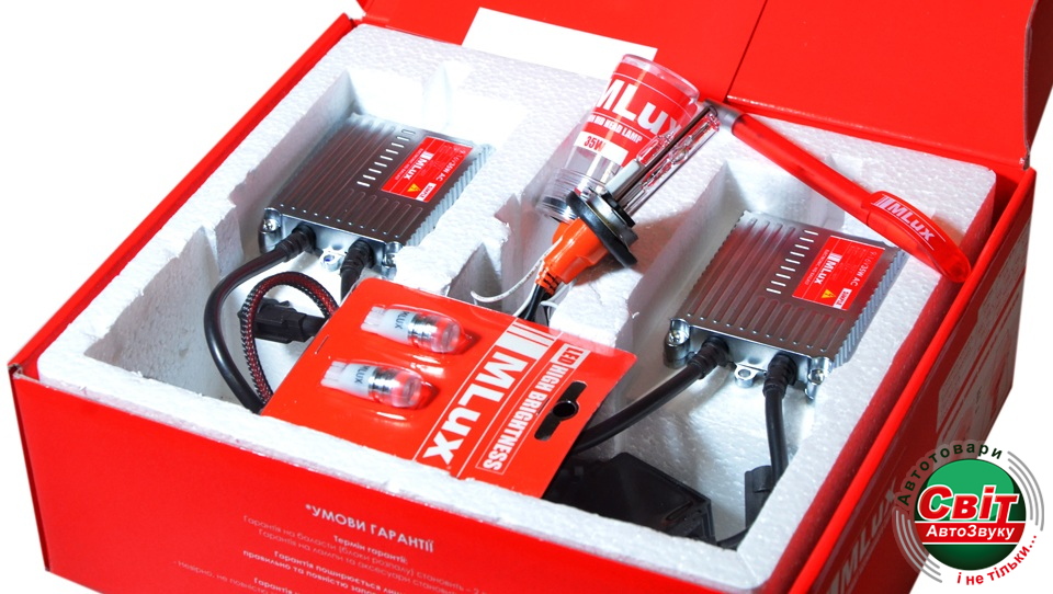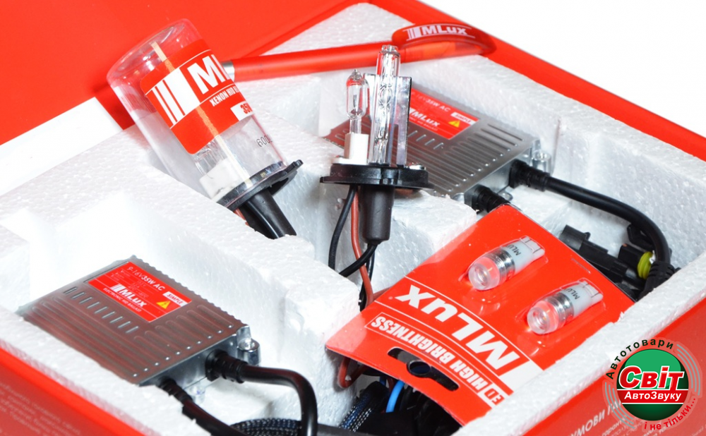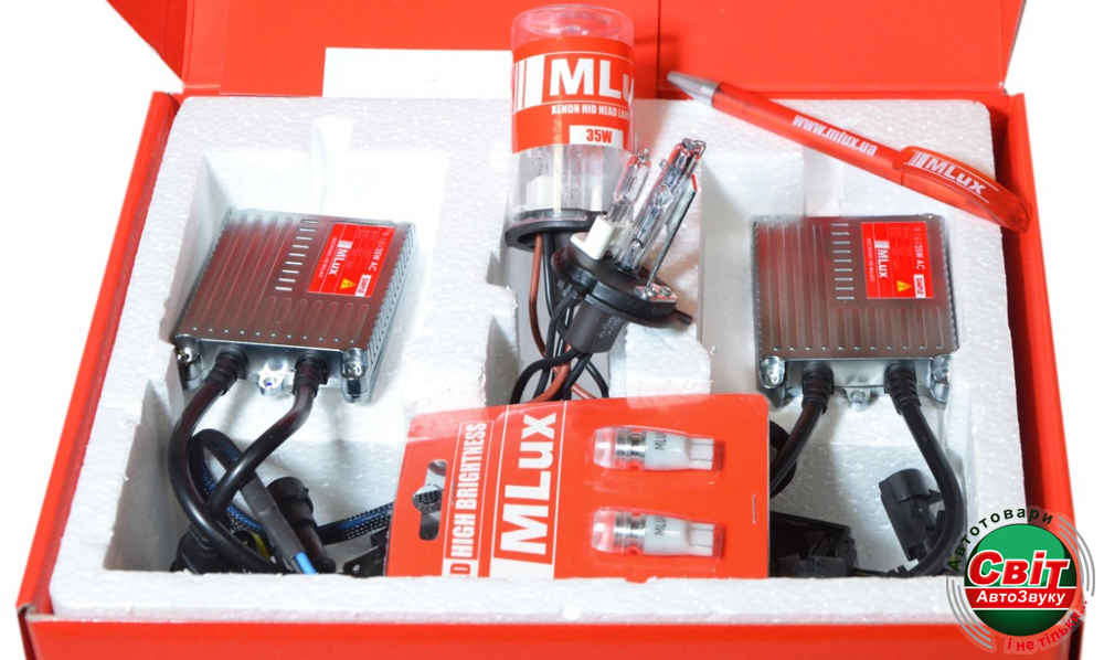 В комплект поставки входит: ксеноновая лампа ксенон+галоген MLux 35 Вт (2 шт.), электронный балласт (блок розжига) MLux SIMPLE 9-16 В 35 Вт (2 шт.), аксессуары для установки и монтажа, гарантийный талон, а также подарочные светодиоды MLux 0101С T10 W5W, предназначенные для установки в габариты.