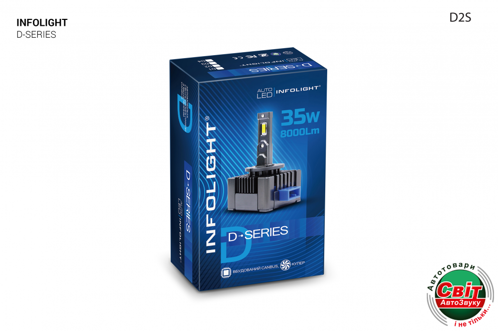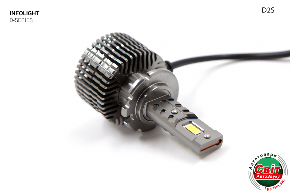 У світлодіодних ламп Infolight головною особливістю яких є технологічність і компактність конструкції. Встановлення ламп проводиться у блок фар головного світла. Конструкція лампи дозволяє легко встановити її в роз'єм штатного блоку розпалювання автомобіля. Infolight D - Series мають ефективні 3570 TOP CSP LED chip кристали, що дозволяє збільшити світловий потік до 8000 Лм з робочою потужністю 35 Ватт. Система охолодження ламп побудована на базі радіатора та кулера (пасивне/активне), це найнадійніший і найрезультативніший спосіб, який добре працює з потужними кристалами. Корпус виготовлений з авіаційного алюмінію, що дає хороші теплообмінні характеристики. Правильне розміщення діодів на лампі дає чіткий світлотіньовий кордон, що забезпечує Вам та водіям зустрічних автомобілів комфорт при нічній їзді.